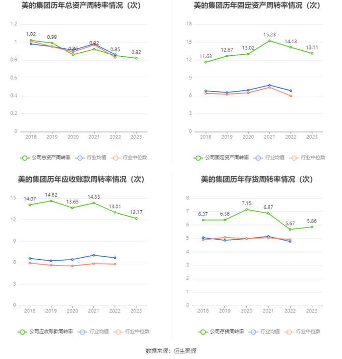 营运能力方面,2023年,公司公司总资产周转率为0.82次,上年同期为0.85次(2022年行业平均值为0.86次,公司位居同行业46/94);固定资产周转率为13.11次,上年同期为14.13次(2022年行业平均值为6.87次,公司位居同行业16/94);公司应收账款周转率、存货周转率分别为12.17次、5.86次。