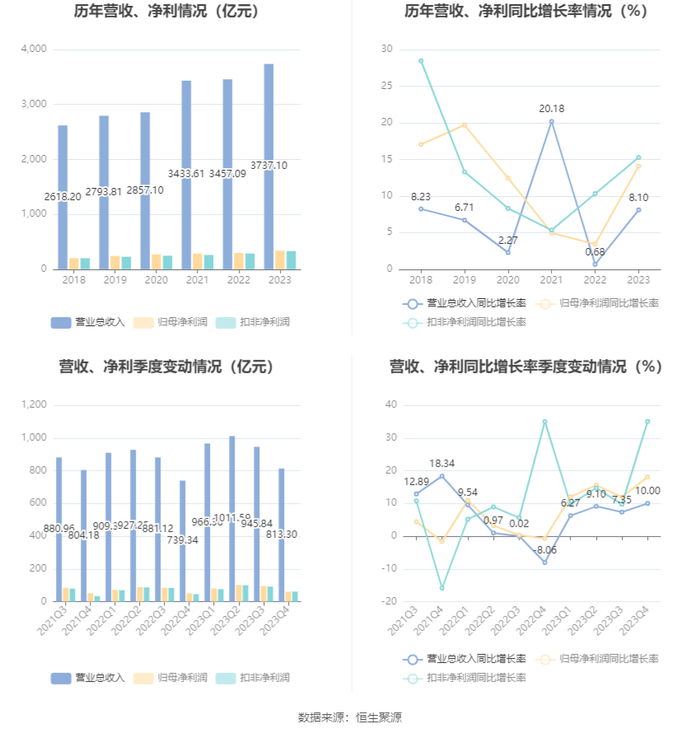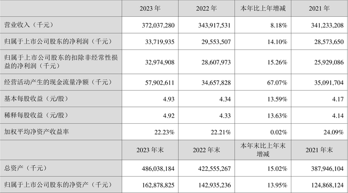 数据显示,2023年公司加权平均净资产收益率为22.23%,较上年同期增长0.02个百分点;公司2023年投入资本回报率为12.83%,较上年同期增长1.53个百分点。