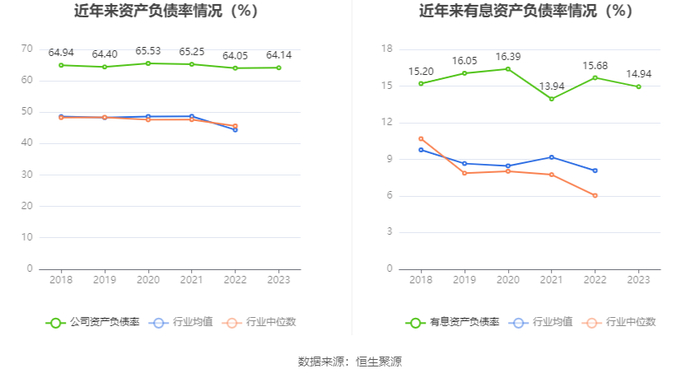 在偿债能力方面,公司2023年年末资产负债率为64.14%,相比上年末上升0.09个百分点;有息资产负债率为14.94%,相比上年末下降0.74个百分点。