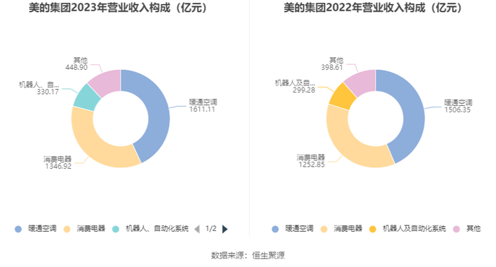 分产品来看,2023年公司主营业务中,暖通空调收入1611.11亿元,同比增长6.95%,占营业收入的43.11%;消费电器收入1346.92亿元,同比增长7.51%,占营业收入的36.04%;机器人、自动化系统及其他制造业收入330.17亿元,同比增长10.32%,占营业收入的8.83%。
