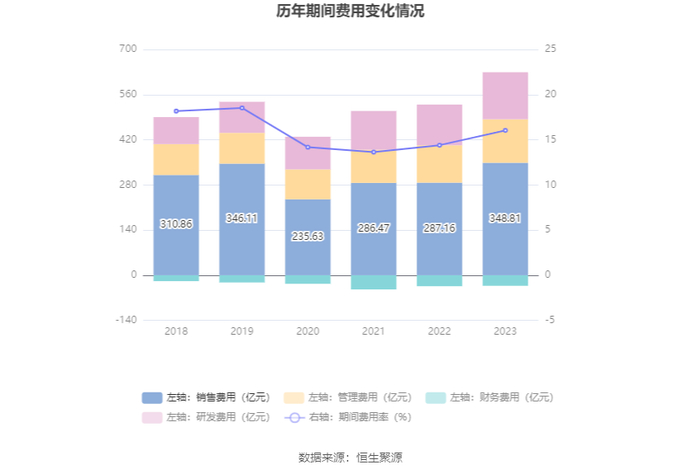 2023年,公司期间费用为596.79亿元,较上年同期增加101.50亿元;期间费用率为16.04%,较上年同期上升1.64个百分点。其中,销售费用同比增长21.47%,管理费用同比增长16.35%,研发费用同比增长15.57%,财务费用由去年同期的-33.87亿元变为-32.62亿元。