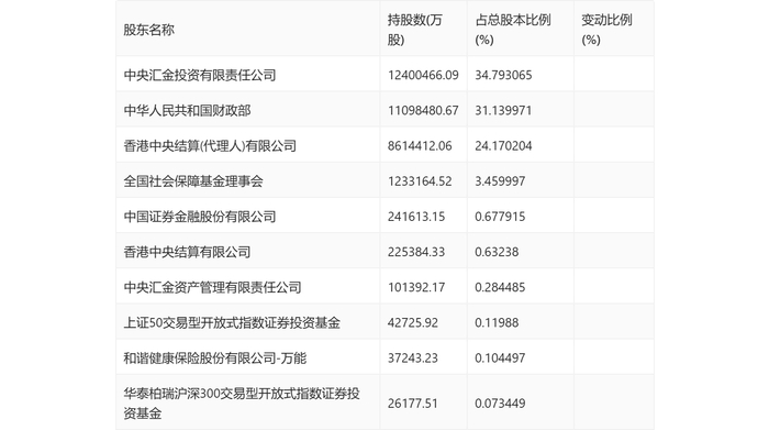 年报显示,2023年年末公司十大流通股东中,新进股东为和谐健康保险股份有限公司-万能、华泰柏瑞沪深300交易型开放式指数证券投资基金,取代了三季度末的华夏人寿保险股份有限公司-自有资金、中国人寿保险股份有限公司-传统-普通保险产品-005L-CT001沪。在具体持股比例上,中央汇金投资有限责任公司、香港中央结算有限公司、上证50交易型开放式指数证券投资基金持股有所上升,香港中央结算(代理人)有限公司持股有所下降。