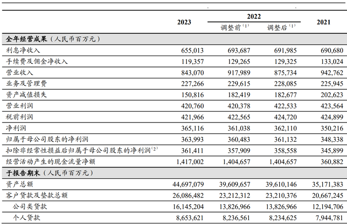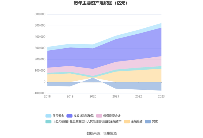分产品来看,2023年公司主营业务中,利息净收入6550.13亿元,同比下降5.58%,占营业收入的77.69%;手续费及佣金净收入1193.57亿元,同比下降7.66%,占营业收入的14.16%;投资收益458.76亿元,同比增长14.06%,占营业收入的5.44%。