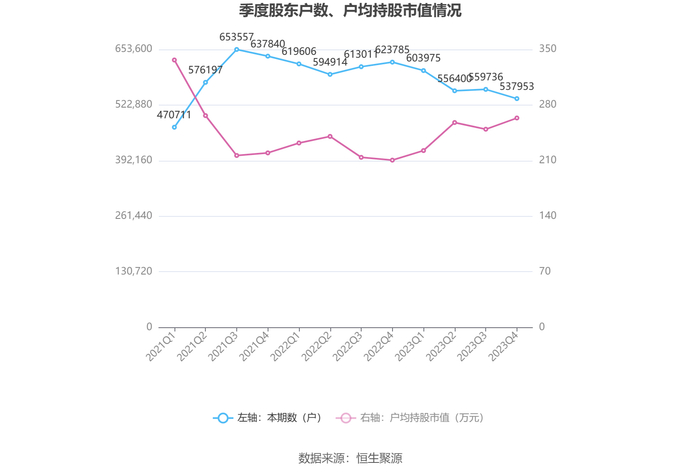 筹码集中度方面,截至2023年年末,公司股东总户数为53.8万户,较三季度末下降了2.18万户,降幅3.89%;户均持股市值由三季度末的249.54万元上升至263.67万元,增幅为5.66%。