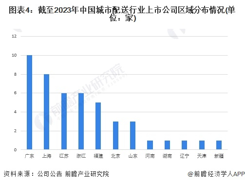 从区域分布情况来看,我国城市配送行业上市公司主要分布在广东省、江苏省、上海市以及浙江省,与区域经济发展相关性较大。内陆、东北、西北等地区城市配送行业上市公司数量较少。