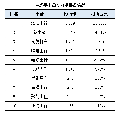 其中,滴滴出行投诉占比高达31.62%,位居行业第一,花小猪和高德打车分别排第二、第三,占比为14.51%和10.80%。