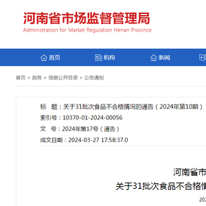 河南省市场监督管理局关于31批次食品不合格情况的通告(2024年第10期)