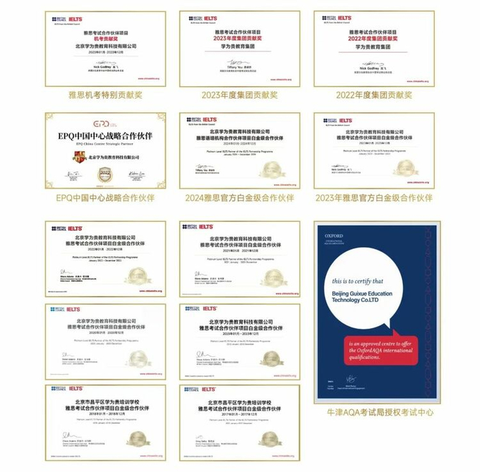 学为贵,连续 8 年获得雅思官方白金级合作伙伴,更是同时斩获雅思官方白金级合作伙伴称号、雅思机考特别贡献奖、集团贡献奖三大极具含金量的雅思官方奖项,是国内第一家也是唯一一家,一次性获此三项殊荣的机构。同时,学为贵也是 EPQ 中国中心战略合作伙伴和牛津 AQA 考试局授权考试中心。