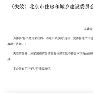 2021年8月5日,北京市住建委发布《关于进一步完善商品住房限购政策的公告》。该公告明确,夫妻离异的,原家庭在离异前拥有住房套数不符合本市商品住房限购政策规定的,自离异之日起3年内,任何一方均不得在本市购买商品住房。