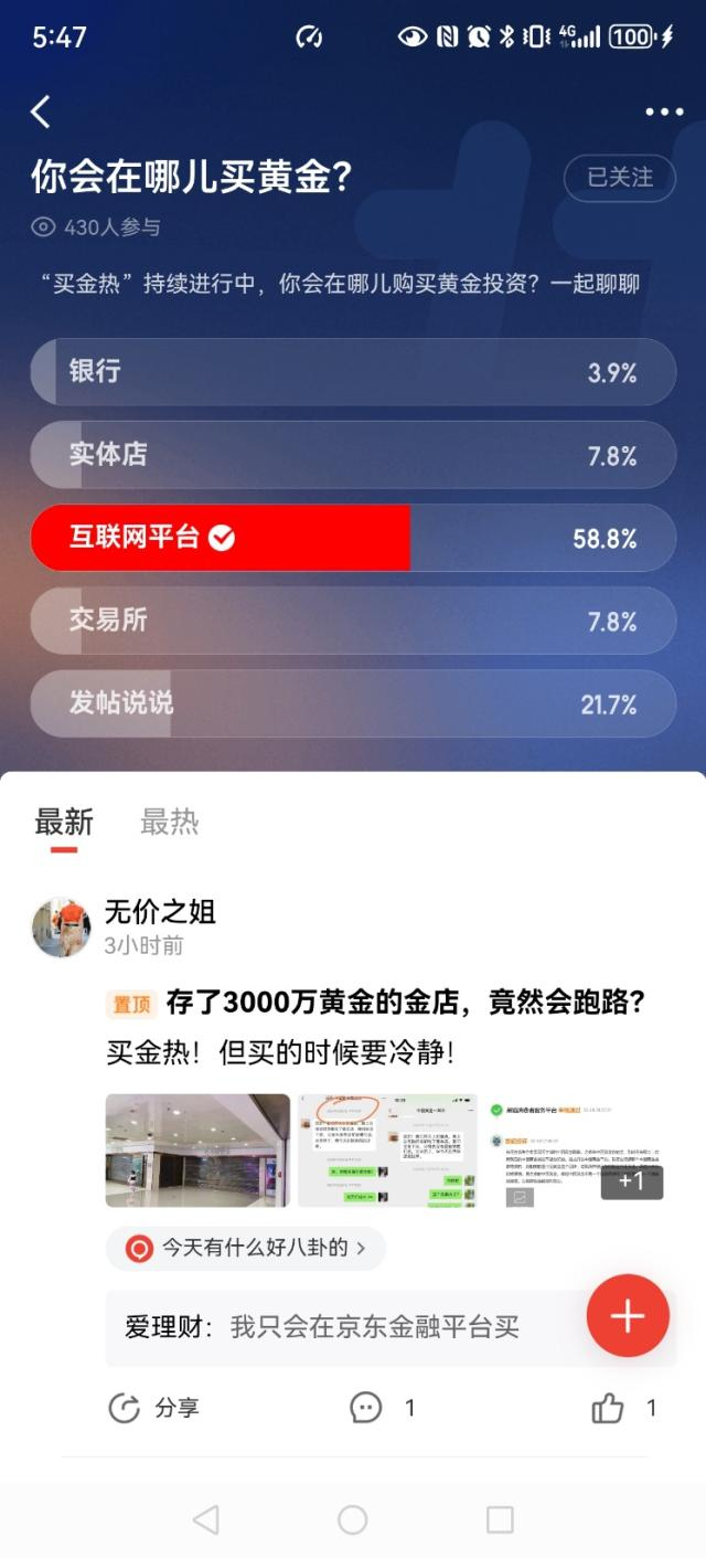 日前,在金融金融App一则关于“你会在哪儿买黄金”的社区投票活动中,有58.8%的用户表示会选择互联网理财平台,在投资产品方面,其中大多数投资者都比较推荐积存金业务。