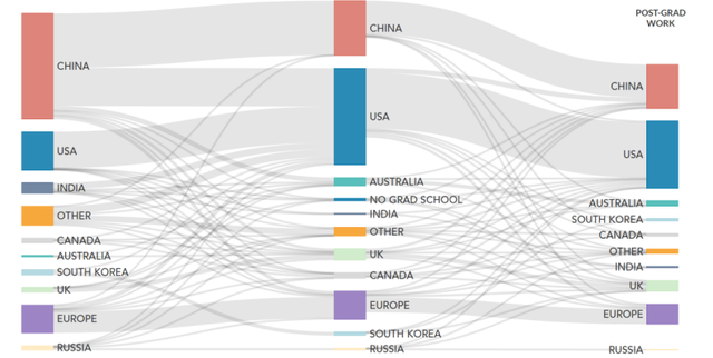 顶级 AI 人才从学习到工作地点的动向,从左往右依次是本科就读地点、研究生院就读地点和毕业后工作地点