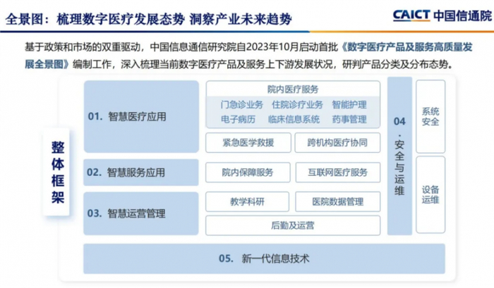 《数字医疗产品及服务高质量发展全景图》由中国信息通信研究院编制,梳理了医疗健康行业的信息化产品、服务、解决方案及企业生态,对产品分类及分布态势深入研判,为政府、医疗机构、企业在医疗信息化数字化领域的布局规划提供参考。榜单覆盖了智慧医疗、智慧服务、智慧运营管理、安全与运维、新一代信息技术等应用板块,是数字医疗领域代表性组织的一次全景展示,其重要性和参考价值不言而喻。