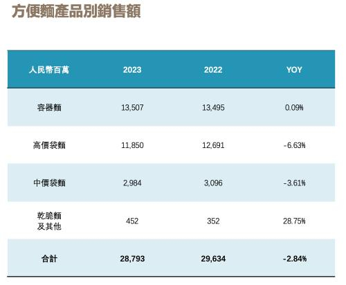 与前三年超6%的增速相比,2023年业绩增长明显放缓;而净利润的大幅增长则是建立在2022年该指标暴跌的基础上,这主要因为方便面原材料价格去年有所回落。