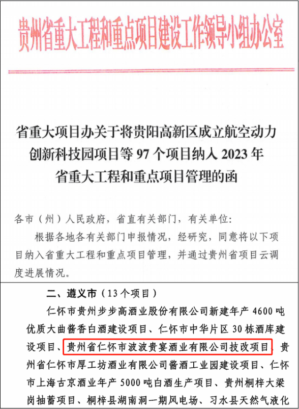 8月24日,贵州省重大工程和重点项目建设工作领导小组办公室发布《关于将贵阳高新区成立航空动力创新科技园项目等97个项目纳入2023年省重大工程和重点项目管理的函》,波波匠酒技改项目再次受到政府高度重视与关注,被纳入贵州省重大工程和重点项目,进行重点支持建设。“旅游+文化+体验”生态圈的打造也步入了一个新的阶段。
