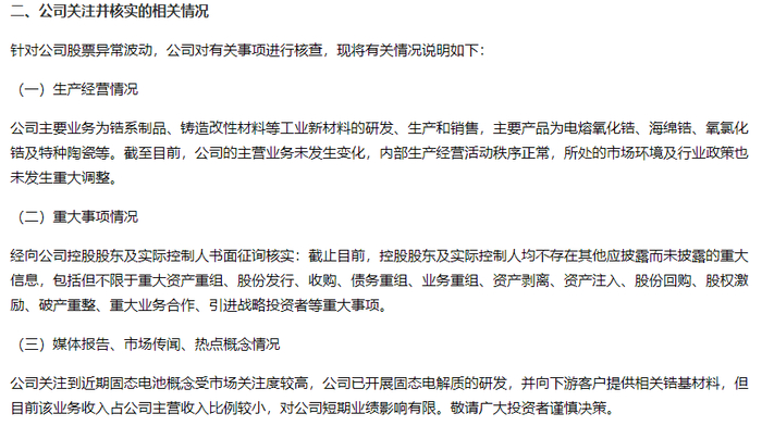 此外,公司表示,关注到近期固态电池概念受市场关注度较高,公司已开展固态电解质的研发,并向下游客户提供相关锆基材料,但目前该业务收入占公司主营收入比例较小,对短期业绩影响有限。