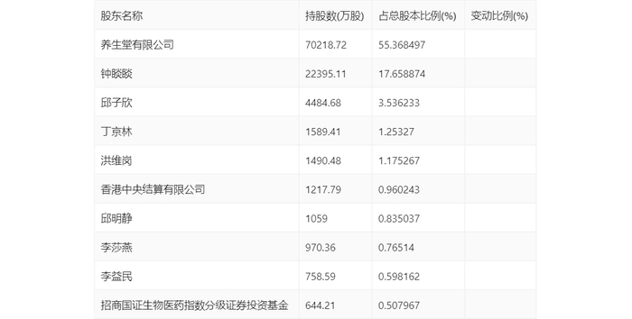 年报显示,2023年年末公司十大流通股东中,持股最多的为养生堂有限公司,占比55.37%。十大流通股东名单相比2023年三季报维持不变。在具体持股比例上,香港中央结算有限公司、邱明静、招商国证生物医药指数分级证券投资基金持股有所下降。