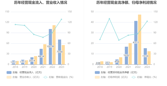 2023年,公司经营活动现金流净额为15.38亿元,同比下降62.79%;筹资活动现金流净额-8.93亿元,同比减少40.20亿元;投资活动现金流净额-20.54亿元,上年同期为-35.14亿元。