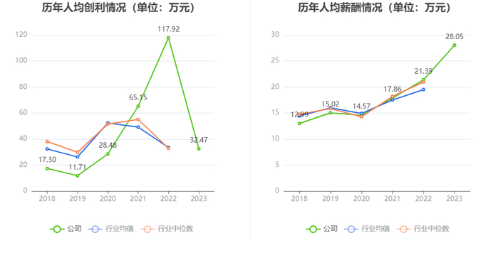 截至2023年末,公司员工总数为3843人,人均创收143.40万元,人均创利32.47万元,人均薪酬28.05万元,较上年同期分别变化-48.51%、-72.47%、31.15%。