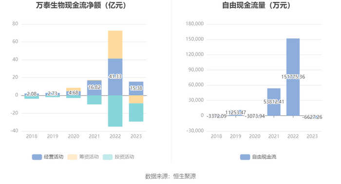 进一步统计发现,2023年公司自由现金流为-6627.26万元,上年同期为15.18亿元。