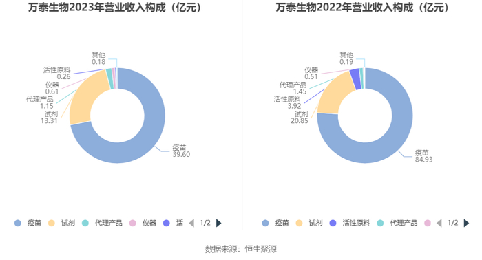 分产品来看,2023年公司主营业务中,疫苗收入39.60亿元,同比下降53.37%,占营业收入的71.86%;试剂收入13.31亿元,同比下降36.16%,占营业收入的24.16%;代理产品收入1.15亿元,同比下降20.95%,占营业收入的2.09%。