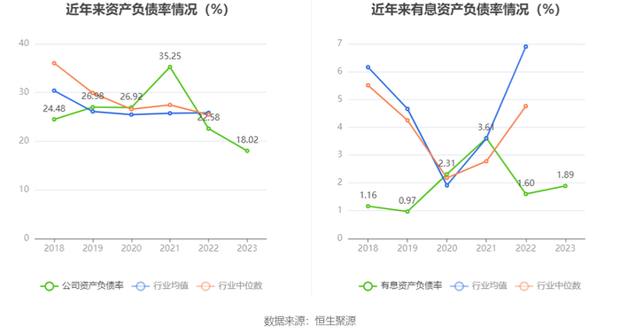 在偿债能力方面,公司2023年年末资产负债率为18.02%,相比上年末下降4.56个百分点;有息资产负债率为1.89%,相比上年末上升0.29个百分点。