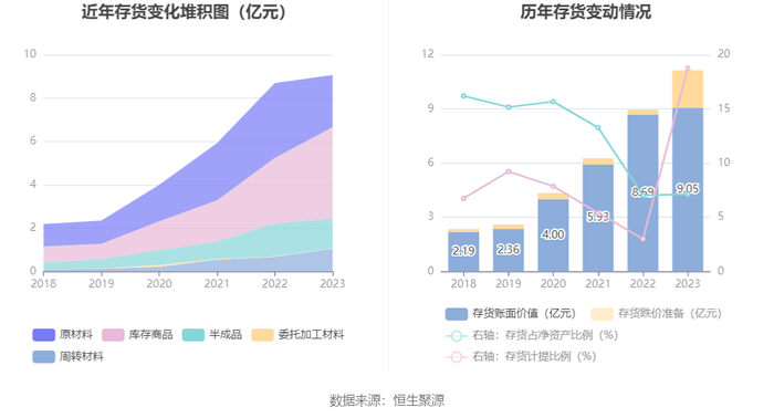 从存货变动来看,截至2023年年末,公司存货账面价值为9.05亿元,占净资产的7.13%,较上年末增加3634.83万元。其中,存货跌价准备为2.09亿元,计提比例为18.75%。