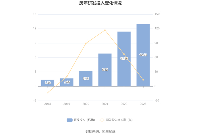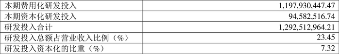 2023年全年,公司研发投入金额为12.93亿元,同比增长13.49%;研发投入占营业收入比例为23.45%,相比上年同期上升13.27个百分点。此外,公司全年研发投入资本化率为7.32%。