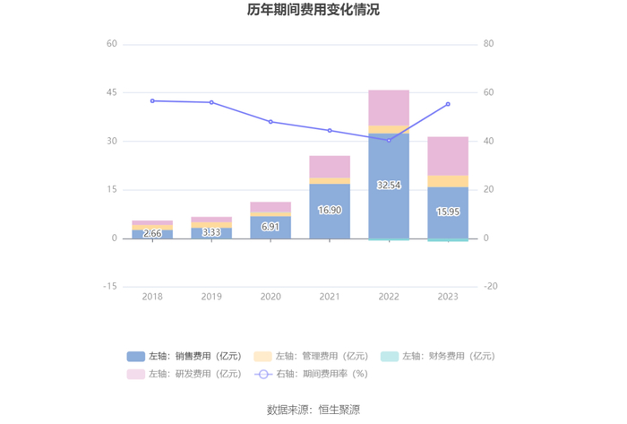 2023年,公司期间费用为30.53亿元,较上年同期减少14.74亿元;但期间费用率为55.39%,较上年同期上升14.92个百分点。其中,销售费用同比下降50.98%,管理费用同比增长50.15%,研发费用同比增长9.0%,财务费用由去年同期的-6161.23万元变为-9297.70万元。