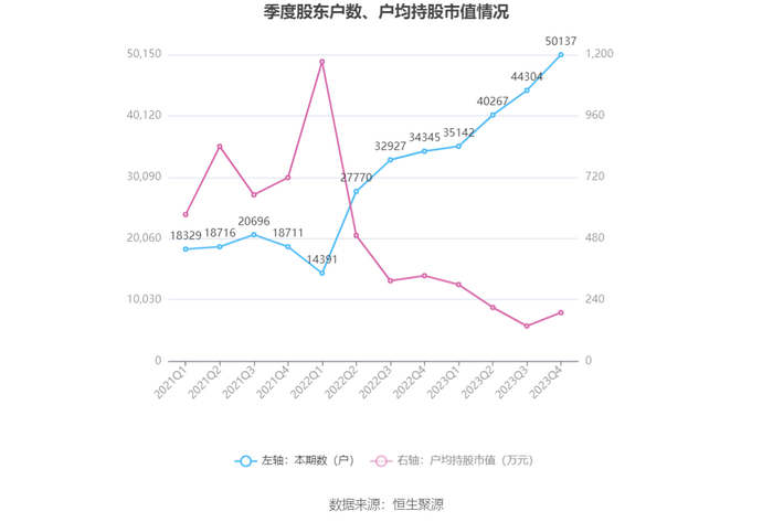 筹码集中度方面,截至2023年年末,公司股东总户数为5.01万户,较三季度末增长了5833户,增幅13.17%;户均持股市值由三季度末的137.34万元上升至190.04万元,增幅为38.37%。