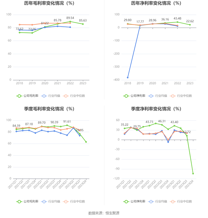 2023年,公司毛利率为85.63%,同比下降3.91个百分点;净利率为22.62%,较上年同期下降20.86个百分点。从单季度指标来看,2023年第四季度公司毛利率为63.00%,同比下降26.40个百分点,环比下降13.95个百分点;净利率为-104.31%,较上年同期下降136.82个百分点,较上一季度下降117.03个百分点。