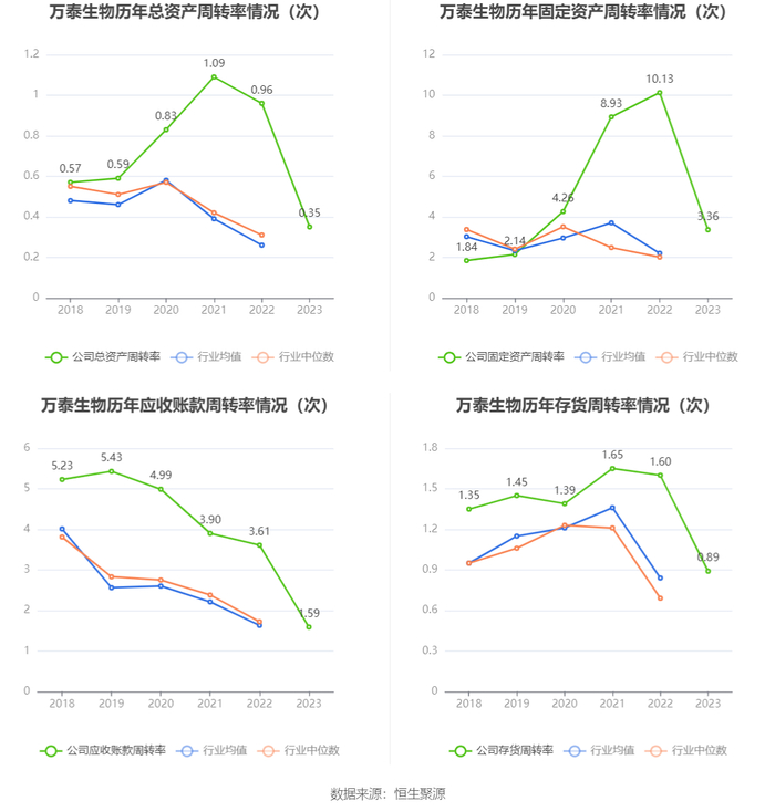 营运能力方面,2023年,公司公司总资产周转率为0.35次,上年同期为0.96次(2022年行业平均值为0.26次,公司位居同行业2/14);固定资产周转率为3.36次,上年同期为10.13次(2022年行业平均值为2.20次,公司位居同行业2/14);公司应收账款周转率、存货周转率分别为1.59次、0.89次。