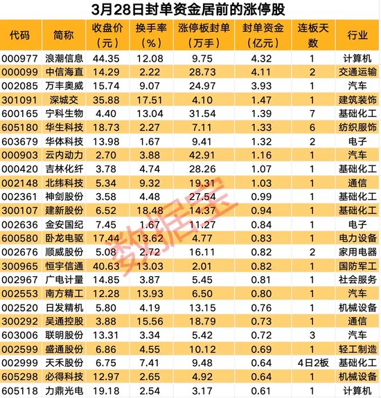 以封单金额计算,10股封单金额在1亿元以上,浪潮信息、中信海直、万丰奥威封单金额居前,分别为4.32亿元、4.11亿元、3.93亿元。