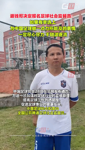 3月28日,足协官网发布通告,公开招聘足球社会监督员。工作属公益性活动,坚持自愿、无偿原则。随后,退钱哥@何胜0423 发博称决定报名试试足球社会监督员。
