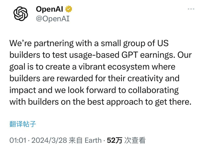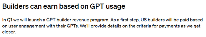 该公司官网的一篇博文内容称,“今年第一季度我们将推出GPT开发者收入计划。作为第一步,美国开发者将依据用户对其GPT的参与度获得报酬。我们会提供有关支付标准的详细信息。”