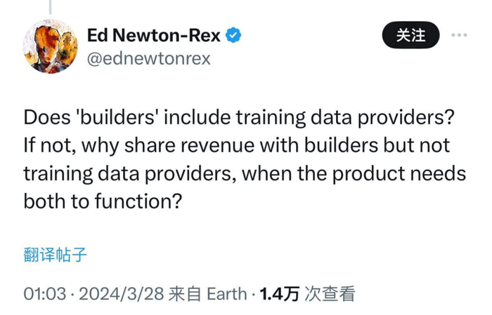 Ed Newton-Rex问道:开发者是否包括培训数据的提供商?如果不是,当产品需要两者都发挥作用时,为何是与开发者分享收入而不是培训数据的提供商呢?
