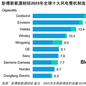 金风科技以16.4GW的新增装机容量蝉联第一,其中95%的装机都位于中国。远景能源新增装机容量15.4GW,位居第二。丹麦整机制造商维斯塔斯(Vestas)以13.4GW的新增装机容量排名第三,是唯一进入前五的欧洲整机制造商。运达股份(10.4GW)超过明阳智能(9GW),排名从去年的第七升至第四。