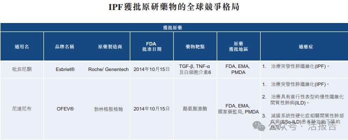 目前全球范围内仅有吡非尼酮及尼达尼布获批准用于治疗IPF。吡非尼酮及尼达尼布的临床反应不是非常显著。吡非尼酮的专利已到期,山德士等多家制造商已上市吡非尼酮仿制药。尼达尼布仿制药预计于2026年在中国上市,用于治疗IPF,并于2029年在美国上市,届时尼达尼布相关专利将到期。