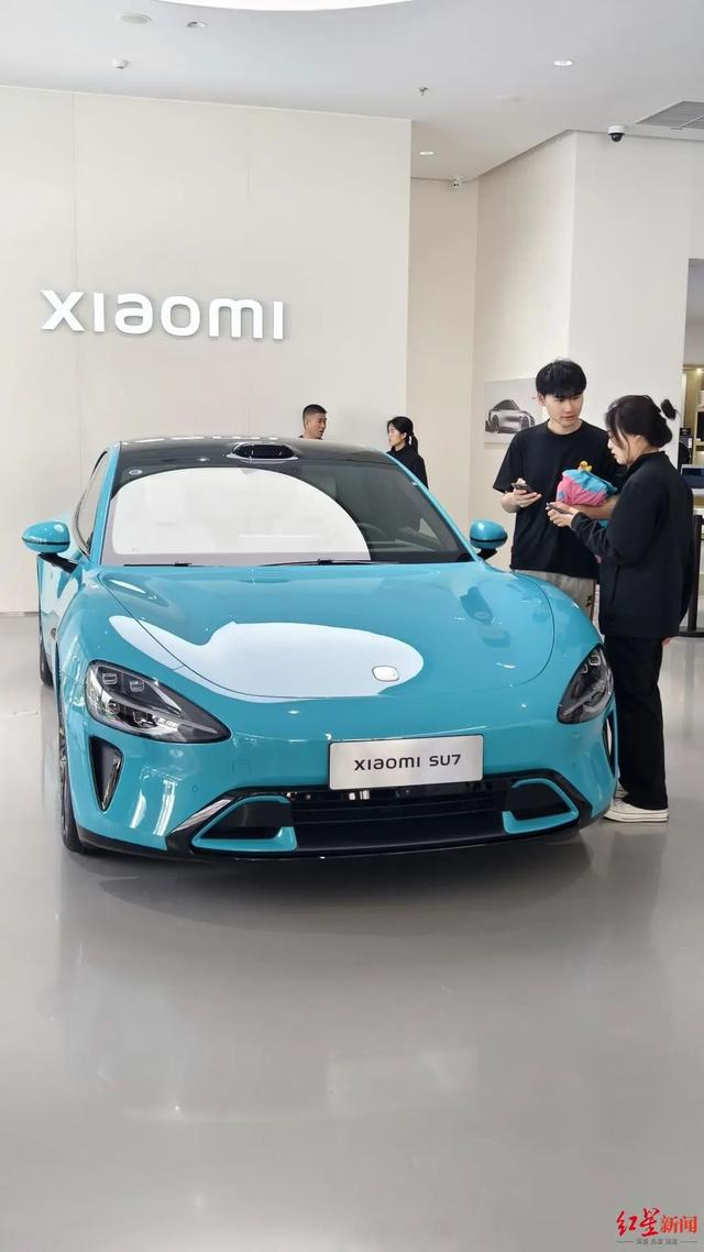 3月25日下午2时许,红星新闻记者来到小米之家成都市成华区万象城汽车旗舰店。汽车专区陈列着海湾蓝、橄榄绿两款小米SU7汽车。在海湾蓝的高配车型前,围观的消费者特别多。