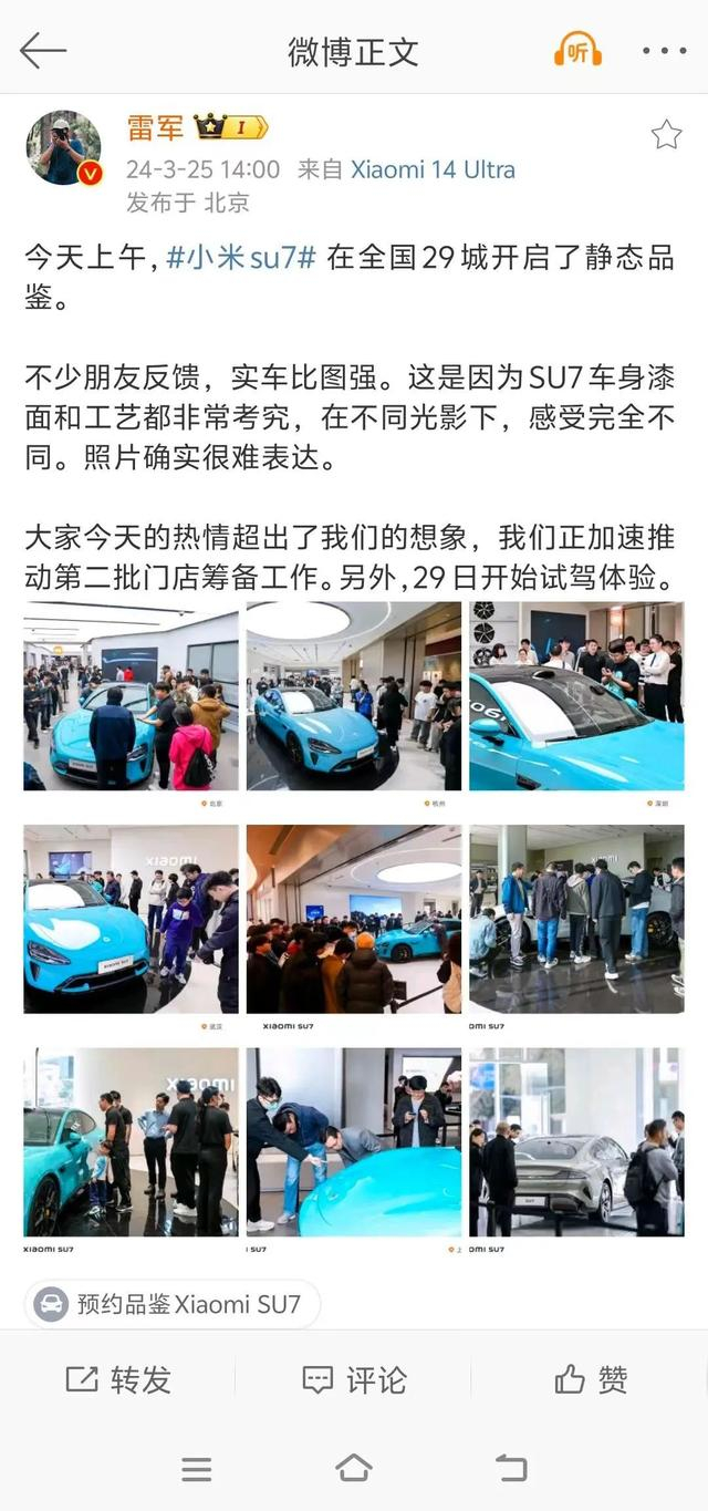 3月25日,雷军发文称,“大家今天的热情超出了我们的想象,我们正加速推动第二批门店筹备工作。另外,29日开始试驾体验。”