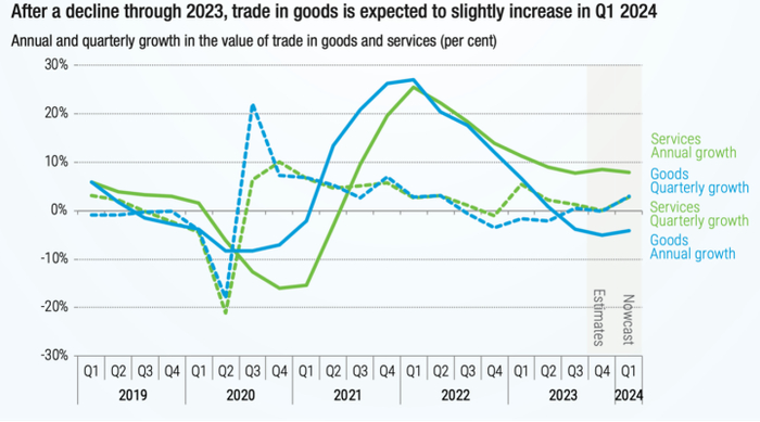 国际货币基金组织(IMF)1月发布的《世界经济展望》显示,2024年全球经济增速预计为3.1%。世界银行(下称“世行”)副首席经济学家兼预测局局长高斯预测,2024年,全球经济增速或为2.4%。同年全球贸易增长约为2.3%,虽较上一年有所提升,但仍将显著低于上一个十年的平均水平。
