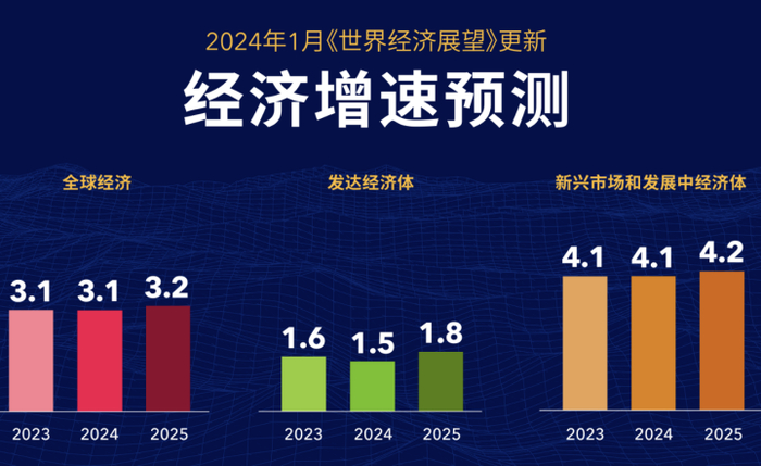 1月,国际货币基金组织(IMF)更新最新经济展望。预计2024年全球经济增速为3.1%,2025年为3.2%。2024年—2025年的预测值低于2000年—2019年3.8%的历史平均水平。