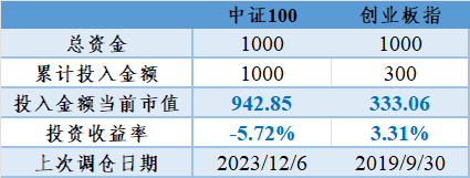 以2019年9月30日为首日,自首日起(含首日)每周最后一个交易日收盘前定额投入1000元,按指数收盘点位作为成本计算本期1000元投入可购入的基金份额,每个工作日收盘后更新累计投入期数、累计投入金额、组合当前市值以及定投累计收益率。分别计算只买入中证100、只买入创业板指,1比1投入中证100和创业板指三种情况的上述指标。