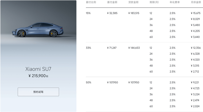 以首付比例33%,首付金额107950元,贷款金额109750元,分36期,月供金额为3224元。小米汽车金融服务披露年化费率2.5%,但实际年化利率为4.763%(以IRR公式计算)。
