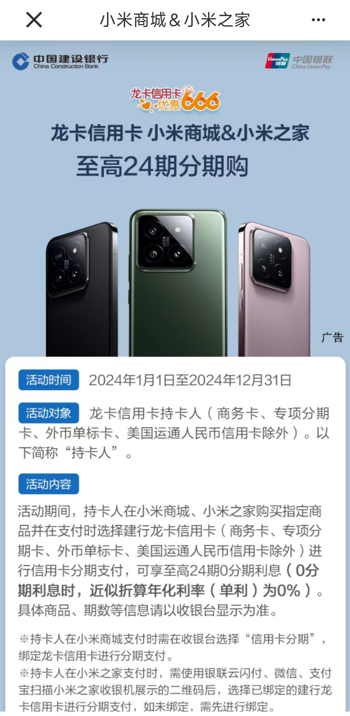另外,龙卡信用卡还有小米分期专区,根据页面披露,2024年1月1日至2024年12月31日,龙卡持卡人在小米商城、小米之家购买指定商品并进行信用卡分期支付,可享至高24期0分期利息(0分期利息时,近似折算年化利率为0%。