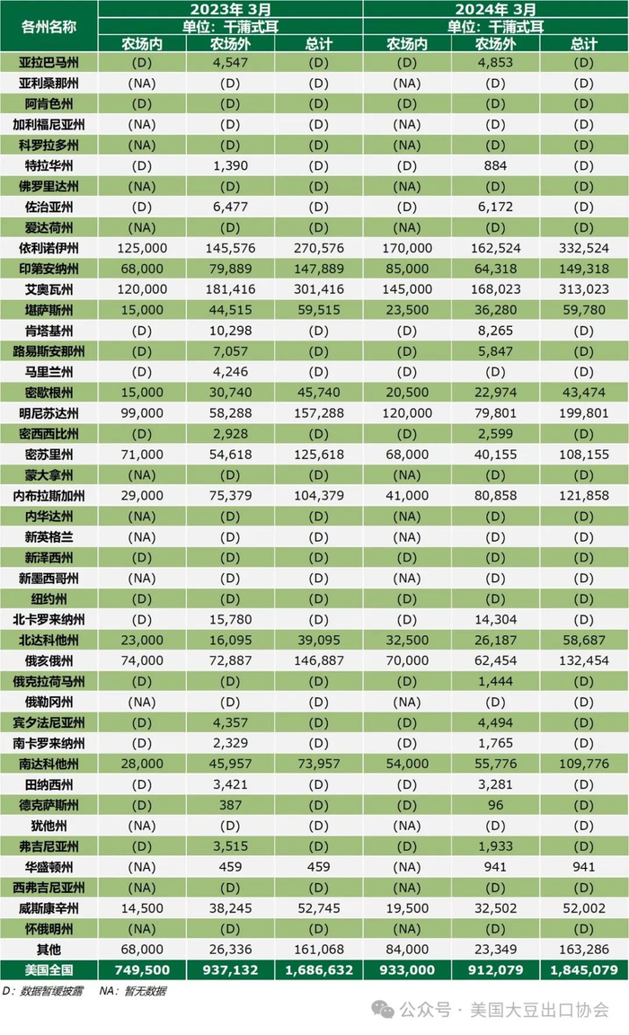 北京时间3月29日凌晨,美国农业部(USDA)发布了2024年度美国大豆种植意向报告及季度库存报告。种植意向报告汇总了近71,800名农户的调查数据,整合分析农户对大豆、玉米、小麦、棉花等主要作物的种植意愿,预测出本年度各种作物的种植面积;季度库存报告则汇总了截至今年3月1日,美国各州大豆等作物的季度库存数据。