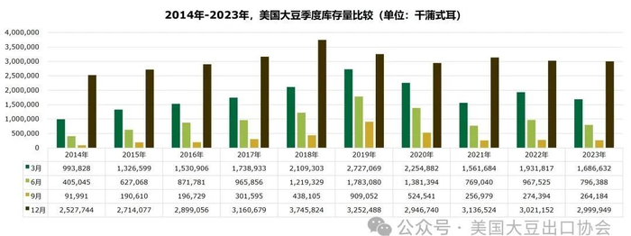 2014年-2023年,美国大豆季度库存量比较