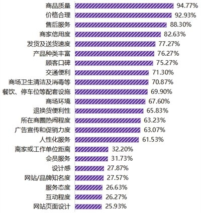 调查显示,选择购物渠道时,超过九成的消费者认为产品质量、价格合理是重要关注因素,其次是售后服务(88.30%)和商家信用度(82.63%)。