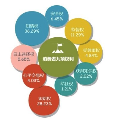 经调查,消费者表示在《中华人民共和国消费者权益保护法》赋予消费者的九项权利中,维权现状最差的3项权利依次为“知情权”“索赔权”和“监督权”,占比分别为36.29%、28.23%和11.29%。消费者的知情权,是指消费者享有知悉其购买、使用的商品或者接受的服务的真实情况的权利。在调查中,64.80%的消费者表示“虚假广告宣传”是现在较为普遍的侵权行为,个别经营者利用虚假广告或其他虚假宣传方式提供商品或者服务,使消费者合法权益受到侵害。此外还有57.65%的消费者表示“质量欺诈、以次充好”是消费过程中较常遇到的侵权行为,这些现象都严重侵害了消费者的“知情权”。提醒广大消费者要树立理性消费观念,增强自我保护意识,增强依法维权意识,了解自身权益,自己的合法权益受到侵害时,积极运用法律的武器维护自己的合法权益。