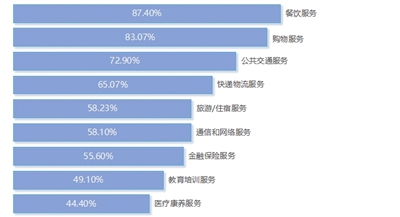在个人或家庭所接触的服务型消费中,消费者主要支出项目为餐饮服务(87.40%)以及购物服务(83.07%)。餐饮服务作为日常生活中必不可少的部分,人们愿意花费更多的金钱去体验美食;购物服务则包括了商超、网购、直播带货等多种形式,随着互联网的普及和发展,人们越来越倾向于通过线上渠道购买商品,享受便捷的购物体验。
