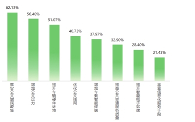 公共交通在城市生活中也扮演着重要的角色,它是连接城市各个角落的重要交通方式,对于减少交通拥堵、降低空气污染、节约能源、改善居民出行体验等方面都具有重要意义。数据显示,消费者最希望公共交通服务改进的方面是落实公交惠民政策(62.13%),其次是增加公交运力(56.40%)和提升车辆硬件环境(51.07%)。
